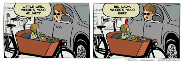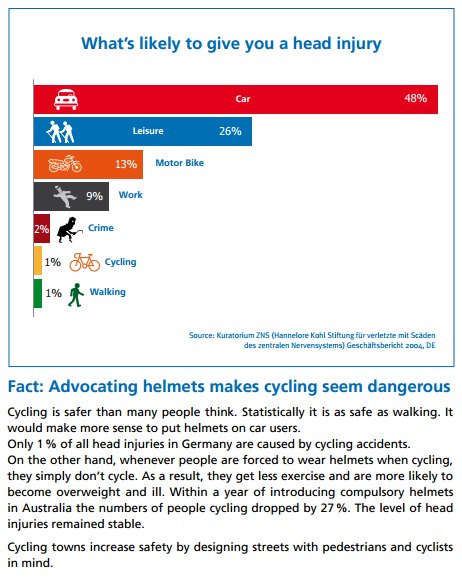 Μερικές φορές βέβαια μπορεί να υπάρξουν κείμενα και αναφορές τους που περιέχουν και εξηγούν την αντίθετη άποψη αλλά επί του πρακτέου, όταν είναι να δοθούν συμβουλές προς αστικούς ποδηλάτες, μέσα σε αυτές σχεδόν πάντα υπάρχει κάποια προτροπή του στυλ: «απαραίτητο αξεσουάρ το κράνος γιά να είσαστε προστατευμένοι, το νερό, η τρόμπα, η σαμπρέλα κ.λπ.»