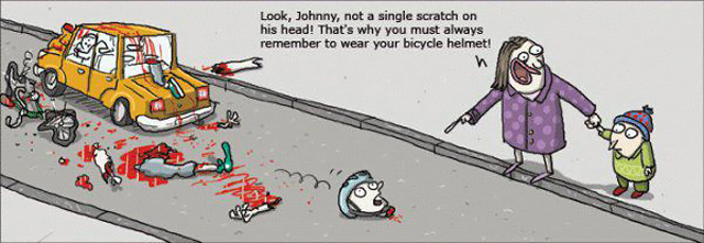 Γιά την καθημερινότητα ως έχει: αν ένας ποδηλάτης παρασυρθεί από αυτοκίνητο, λεωφορείο ή μηχανάκι, τίποτα δε μπορεί να τον προστατέψει…