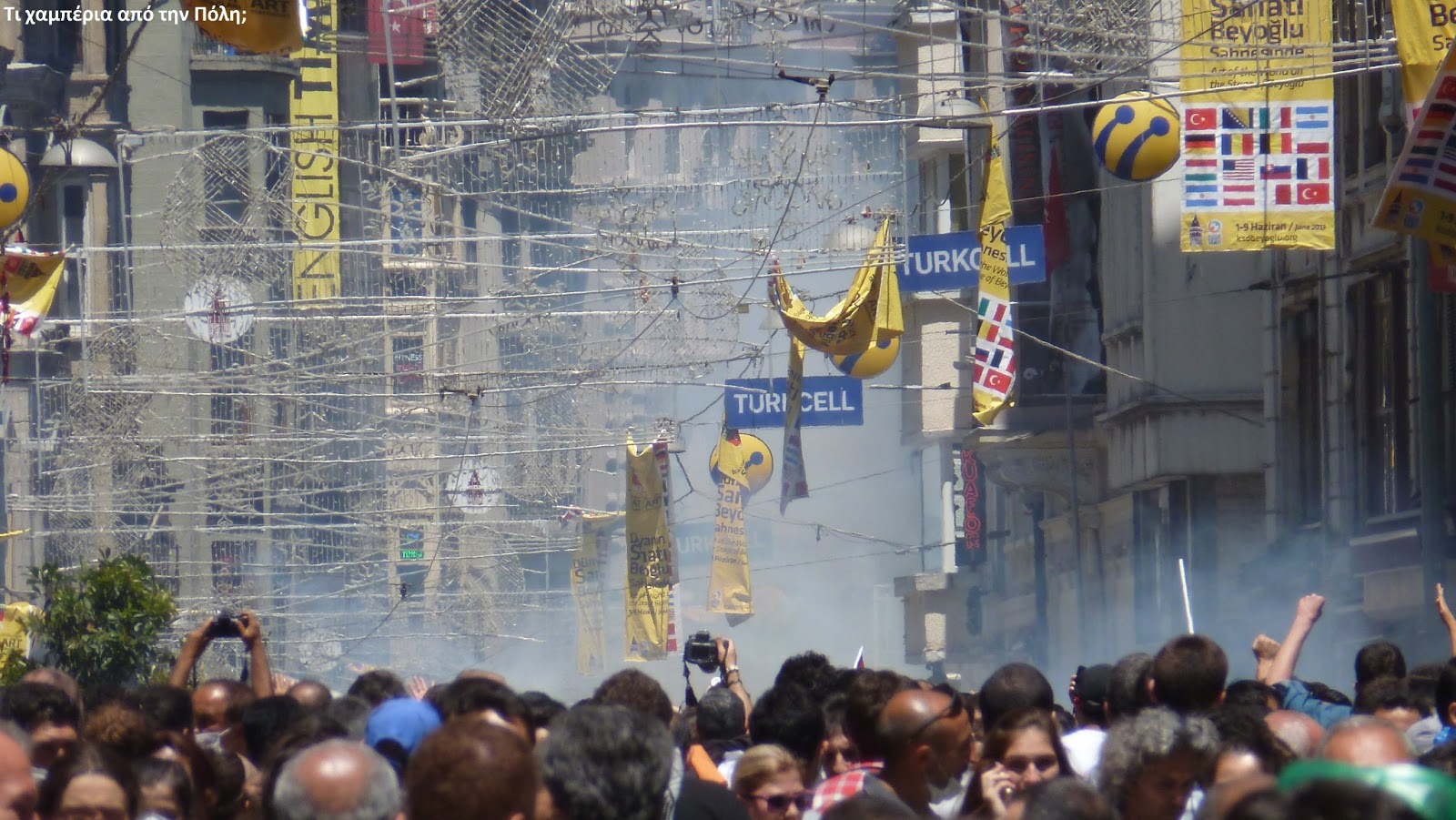 Φαίνεται ότι οι δυνάμεις καταστολής “ζήλεψαν” τις πρακτικές των δικών μας “Παπουτσήδων” στην πλατεία Συντάγματος και απαντούσαν με χημικά ακόμα και σε κάθε σύνθημα των διαδηλωτών. Τα πρώτα πολλά χημικά με βρήκαν κοντά στο Syriye Pasaji και μόνη διαφυγή ήταν να μπώ στην στοά. Γρήγορα αντιλήφθηκα ότι είχαμε παγιδευτεί σαν τα ποντίκια και το πρόβλημα με την αναπνοή, μας ταλαιπωρούσε όλο και περισσότερο. Ευτυχώς τότε οι άνθρωποι από τους ορόφους της στοάς μας άνοιξαν τις πόρτες τους προσφέρωντας προστασία σε κάμποσους από εμάς.